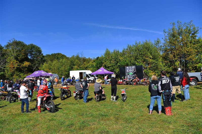 The reunion congregated with a pilgrimage of roughly a hundred core active members, back to the New England roots that spawned this club of sorts, hosted on Travis Stopa's recently shredded and well-marked Hare Scramble course. Mid-September brought with it the kind of weather riders pray for at every event, skies of azure, perfectly procured temps and trees in various shades of fall's best. Greetings at the gate to the compound, where safe passage demanded one of the Golden Tickets involved the maestro himself plus a masked caper like comic villain carrying out the deeds for entry. The manicured grass parking fields were filled with a vibe of chill, VP T2 and a complete line-up of legendary and well-known racers spanning decades and diehards including some of the best photogs in the moto industry: Mark “Kato” Kariya and Art Pepin of Offroad Paparazzi fame.
