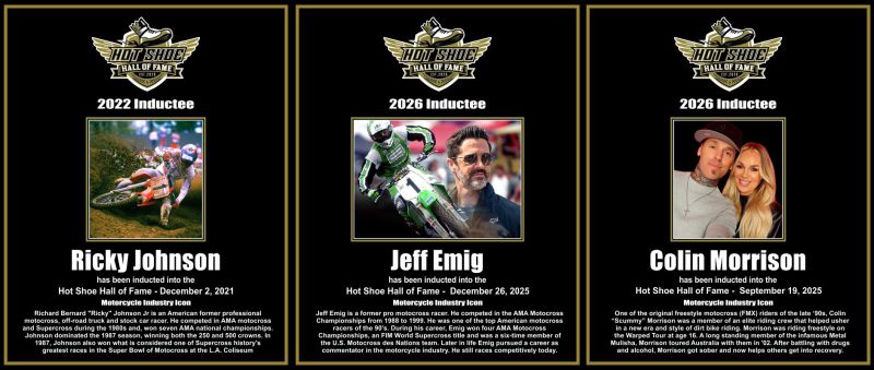 Three former two-wheel superstars – Ricky Johnson, Jeff Emig and Colin “Scummy” Morrison – have been added to the featured guests on Saturday, Jan. 31, in the sixth annual “Hot Shoe” Hall of Fame Museum and Motorcycle Industry Celebration at the Las Vegas’ Notoriety Theatre in the famed Las Vegas Fremont Street Experience (450 E. Fremont St., 3rd Floor).